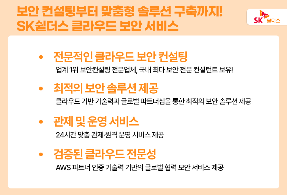 전문적인 컨설팅부터 24시간 실시간 관제까지 보다 안전한 클라우드 운영 환경을 구하고 싶다면, 클라우드 환경에 최적화된 SK쉴더스의 클라우드 보안 서비스를 고려해 보세요!