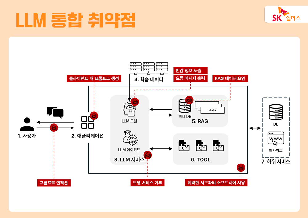 그러나, LLM이 다양한 애플리케이션에 적용됨에 따라 보안 문제 역시 발생하고 있습니다. 국방 분야에서도 여러 국가가 LLM을 활용하기 위해 경쟁 중이며, 분야 특성 상 보안과 안전성이 중요하기 때문에 LLM 보안에도 특히 신경 쓰고 있죠. SK쉴더스가 함께한 ‘8차 국방 데이터 혁신 네트워크’에서 역시 ‘LLM 보안’ 관련 최신 동향은 주요 이슈였습니다. 민간 분야 역시 마찬가지입니다. 소비자가 챗봇을 설득해 1달러에 자동차 구입을 완료하거나 LLM으로부터 마약 제조법을 알아내는 등의 사건이 발생하기도 했죠. 이는 어느 LLM 이건 내부적으로음란물이나 편향성 정보 등의 출력을 통제하는 시스템이 있지만, 이런 조건을 우회하고 공격자 요청을 실행하도록 강제하는 기법인 프롬프트 인젝션을 악용한 사례입니다. 또 다른 사례로, 악의적 프롬프트를 특정 페이지에 올리고 LLM이 이에 접근하는 방식으로, 피해자가 해당 페이지 관련 질문을 하면, LLM은 공격자가 의도한 답변을 출력하게 됩니다. AI 모델이 올바르게 동작하도록 하고, 보안 위협에 대응하기 위해서는 체계적인 진단과 개선이 필요한데요. SK쉴더스 EQST그룹이 공개한 ‘LLM Application 취약점 진단 가이드’를 통해 LLM 애플리케이션 진단 시 활용할 수 있는 '진단 절차', '진단 항목' 및 '대응 방안'을 함께 알아보겠습니다.
