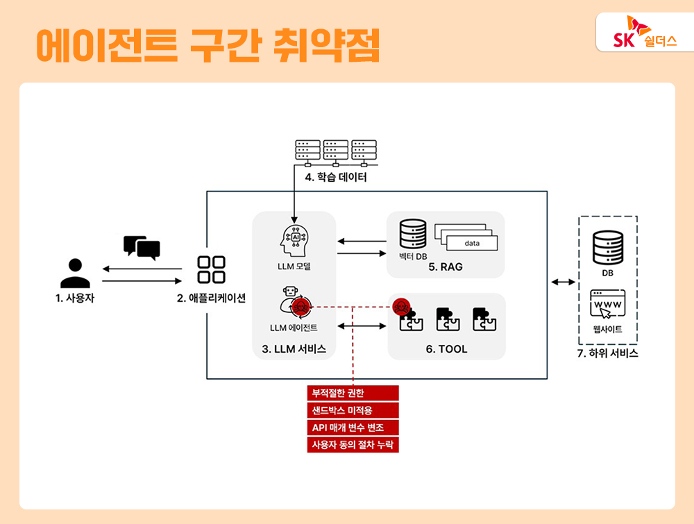 에이전트 구간에서는 LLM 에이전트 및 LLM 에이전트와 툴의 상호 작용에서 발생할 수 있는 취약점을 다루는데요. LLM 에이전트는 사용자의 요청에 따라 시스템이 의도하지 않은 기능을 실행하거나 별도의 권한이 필요한 외부 자료를 열람하는 등의 위협이 존재할 수 있으며 LLM 에이전트가 툴을 호출할 때 공격자의 악의적인 요청을 그대로 전달하여 공격자가 의도한 기능을 수행할 수 있습니다.