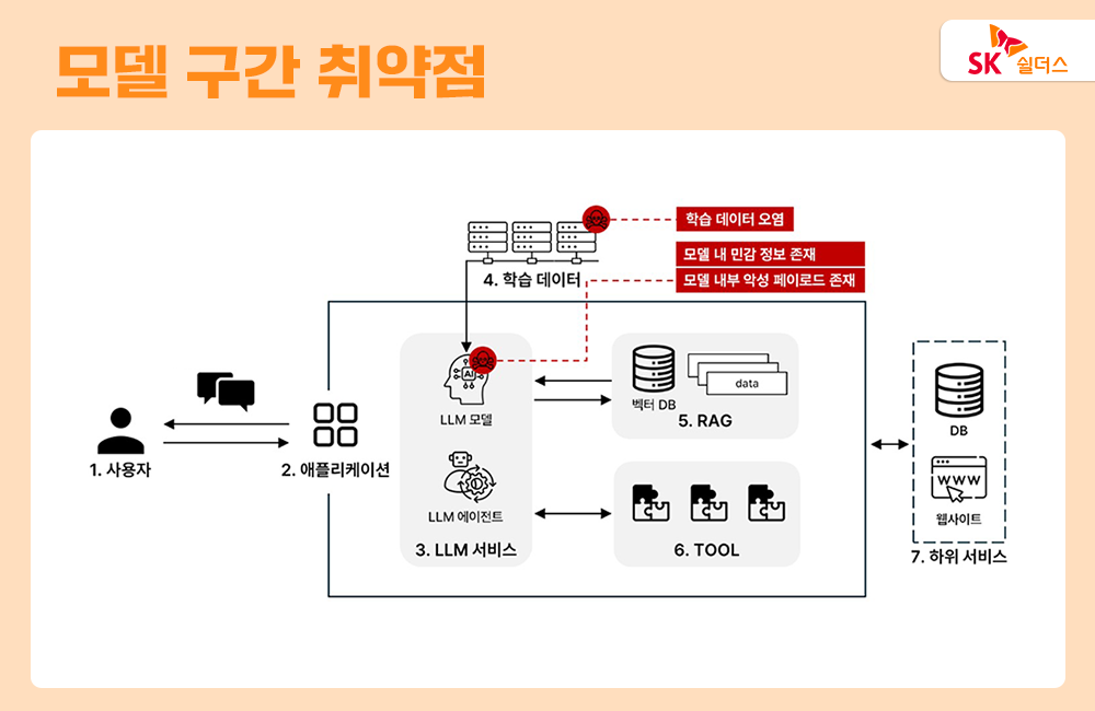 모델 구간의 경우, LLM 모델 개발 시 사용된 학습 데이터 혹은 미세 조정에 사용된 학습 데이터의 취약성과 완성된 모델 자체에서 발생될 수 있는 취약점을 다룹니다. 이 경우는 학습 데이터에 민감 정보가 포함되어 노출되거나 LLM 모델에서 취약한 템플릿 등을 사용해 발생되는 취약점으로 주로 공급망에서 오염된 데이터 및 취약한 모델을 받아 사용함으로써 발생됩니다.