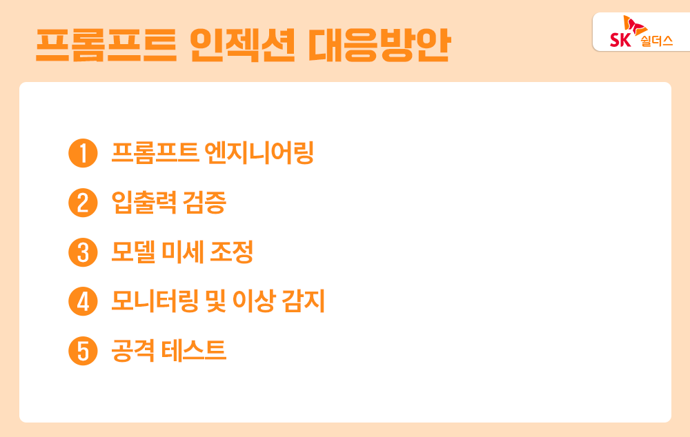 SK쉴더스 EQST그룹이 공개한 ‘LLM Application 취약점 진단 가이드’에서는 이번 포스팅에서 담은 내용을 포함해 LLM Application의아키텍처와 동작 원리, LLM Application 점검 구간별 발생 가능한 취약점이 생성되는 과정과프롬프트 인젝션의 원리와 공격 기법 등 심층적인 내용을 다루고 있습니다. 더 자세한 내용은 리포트 전문을통해 확인해 보세요!